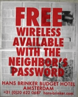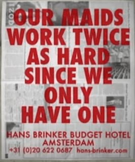 Αν είχατε ένα ξενοδοχείο θα περηφανευόσασταν ποτέ ότι οι φιλοξενούμενοι σας για να έχουν Wi-Fi θα πρέπει να κλέψουν από το γείτονα τους και ότι οι καθαρίστριες τους δουλεύουν τις διπλάσιες ώρες γιατί απλώς έχουν μόνο… μία; Και όμως αυτή είναι μια από τις διαφημιστικές προσπάθειες του «λιτού» ξενοδοχείου Ηans Brinker που βρίσκεται στο Άμστερνταμ της Ολλανδίας.