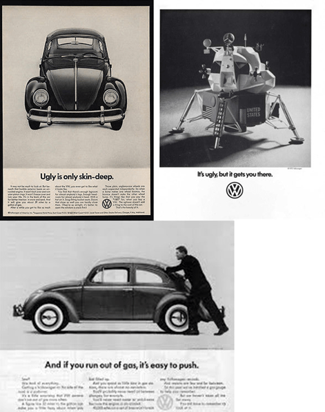 Η εκστρατεία Think Small όπως ονομάστηκε είναι minimal και αποπνέει μια φρεσκάδα, κάνει χιούμορ και κοροϊδεύει επιδεικτικά το ίδιο το αυτοκίνητο βγάζοντας στην επιφάνεια τα ελαττώματα του, κάτι πρωτοφανές για την ίδια την εποχή που τα ήθελε όλα τέλεια, φιλοσοφία αρκετών εταιρειών που ισχύει μέχρι και σήμερα. Οι επικεφαλίδες των διαφημίσεων «ugly is only skin deep» και «nobody’s perfect» κάνουν το κοινό να χαμογελάει αλλά και ταυτόχρονα να εμπιστεύεται την προσπάθεια της VW καθώς οι πωλήσεις του αυτοκινήτου εκτοξεύονται.