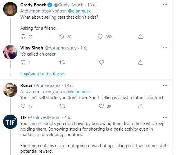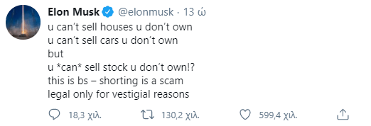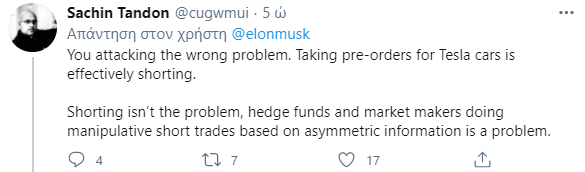 Fact4. Ένα Fund, προσπάθησε το 2017 να αγοράσει πολλές μετοχές της Tesla, και να τις πουλήσει με τέτοια αξία ώστε να κερδίσει εις βάρος της ίδιας της Tesla, μειώνοντας την αξία της. Ο ιδιοκτήτης της Tesla, τάχθηκε δημόσια εναντίον τους, και κατάφερε με την δημόσια ισχύ και την επιρροή που έχει προς τους επενδυτές του, να κρατήσει όρθια την εταιρεία και να μην υποστεί (μεγάλη) ζημιά.